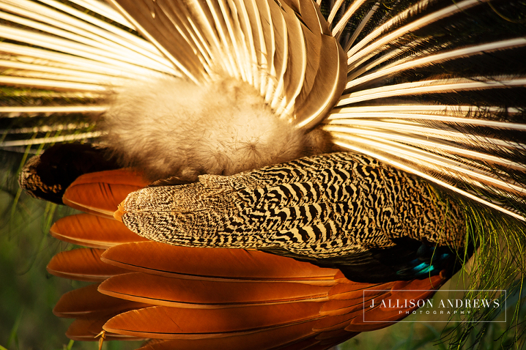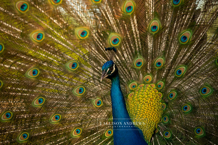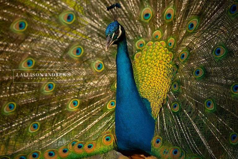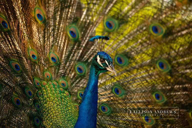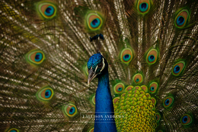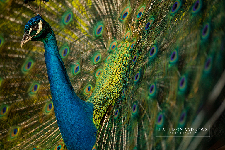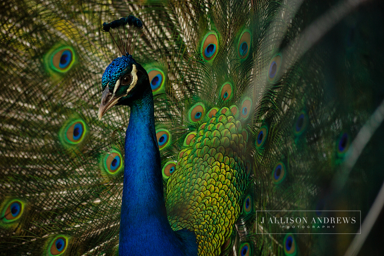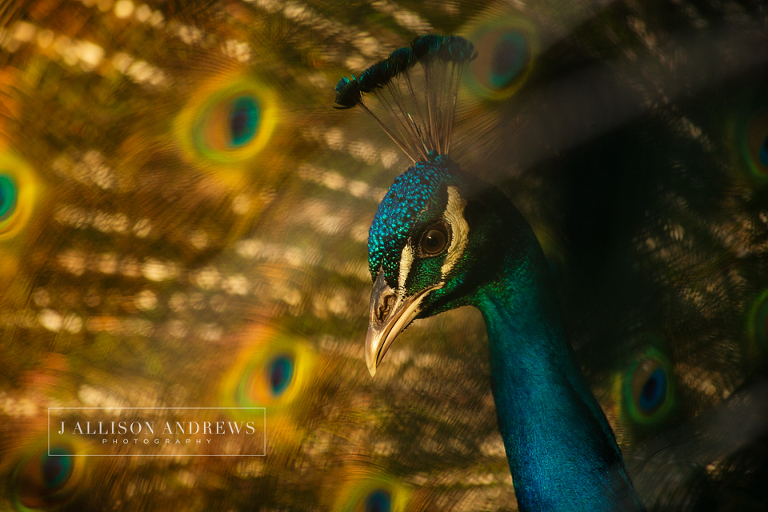 I take TONS of videos and pictures of them, all the time. It doesn’t get old because I am never bored of their beauty or intriguing behavior. Springtime is particularly fun because the males really hone their strutting techniques. Constantly unfurling their brilliant feathers in hopes of gaining the female’s attention – and also the humans’ – they are truly captivating. I rarely have my real camera out but tonight Sturgill was around the pool near the bird feeders and I dropped what I was doing to catch some really neat shots of him. He performed for me for probably a half hour. I also captured some unique video of him as well.
