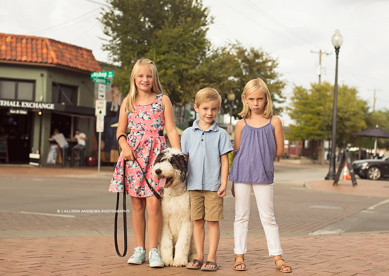 But back to my clients. My kids – minus one. My oldest daughter takes a theater class on Wednesday evenings so she wasn’t able to join us for the mock photo session. “Lucky me!” she said as I dropped her off and got ready to drive to the other side of DFW with the rest of the kids in tow + Dottie, our 11 month old Sheepadoodle. Unlike the vibrant and enthusiastic feel of the neighborhood, my three are quite the contrary. They aren’t really too pumped about helping me out…and mainly I’m talking about my Camille. Really, it just takes one to set the mood for the rest of the bunch. Isn’t that right, Moms?